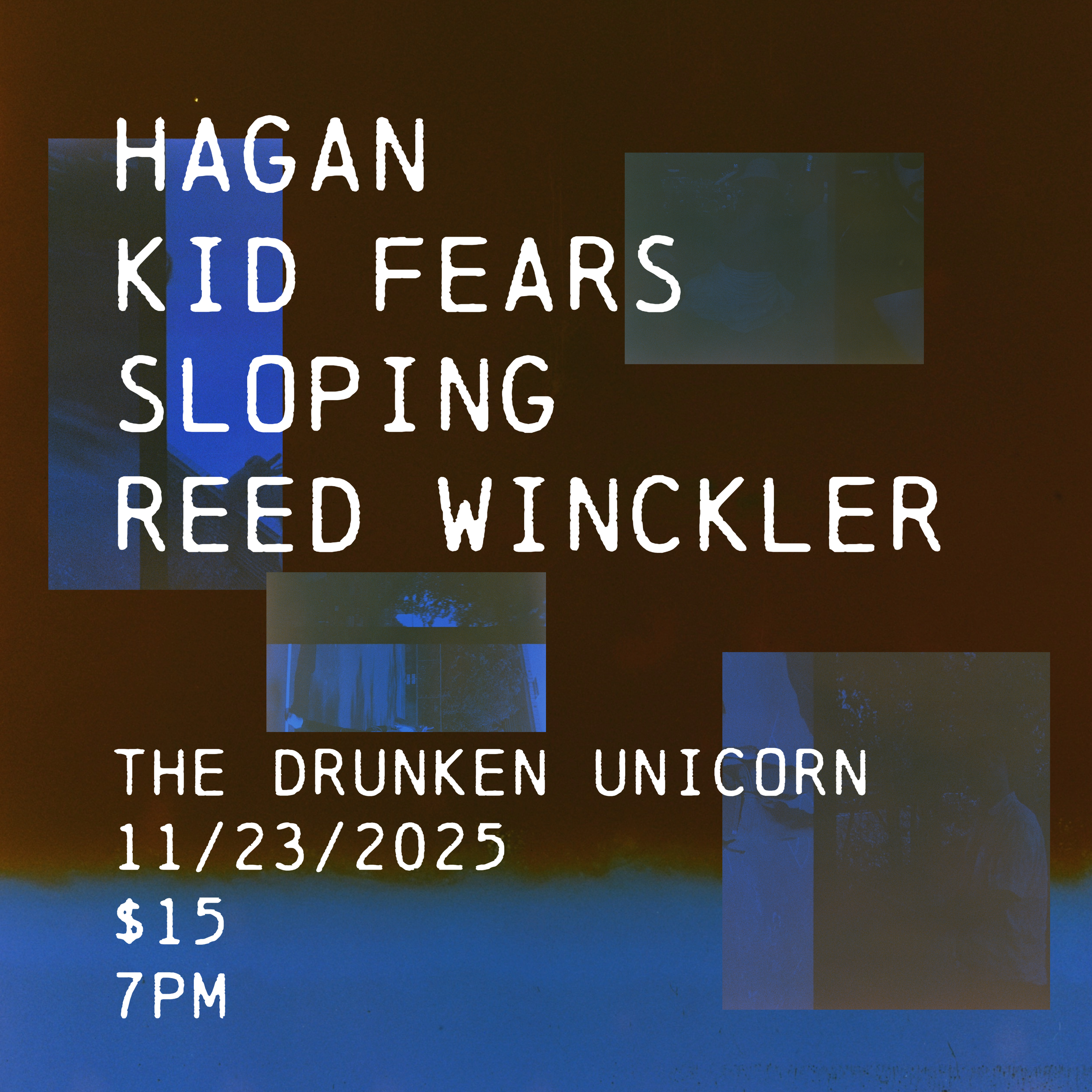 Hagan, Kid Fears, Sloping, Reed Winckler Sunday, November 23, 2025 7:00 PM 11:59 PM Google Calendar ICS Sunday, November 23rd at Drunken UnicornNobody’s Booking presents..Hagan, Kid Fears, Sloping, Reed WincklerDoors at 7:00pm / $15 / 21+ Tickets Kid Fears Sloping Reed Winckler TICKETS